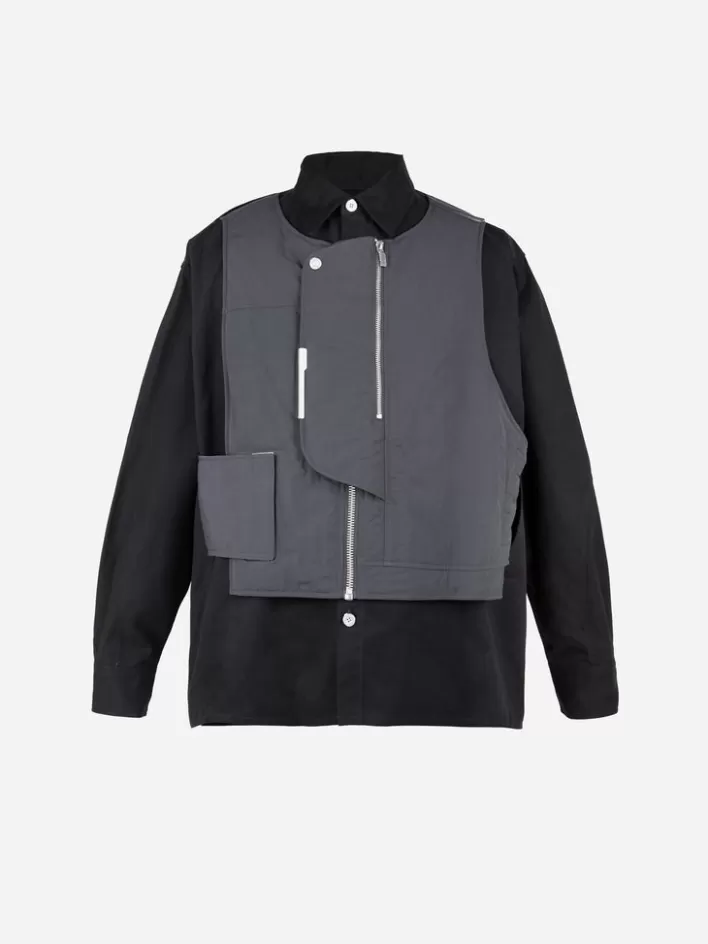 Cotton Twill Shirt In Black. Spread Collar. Botton Closure At Front. Single-Button Barrel Cuffs. Shirttail Hem. Detail Letters Printed At Back. Cut-Out Detailing At Shoulders And Side-Seams. Detachable Panelled Technical Quilted Vest Overlay Featuring Partially Concealed Zip Closure With Press-Stud Placket At Front. Waist Pocket At Right Side. Antiqued Silver-Tone Hardware. Tonal Tone Stitching.