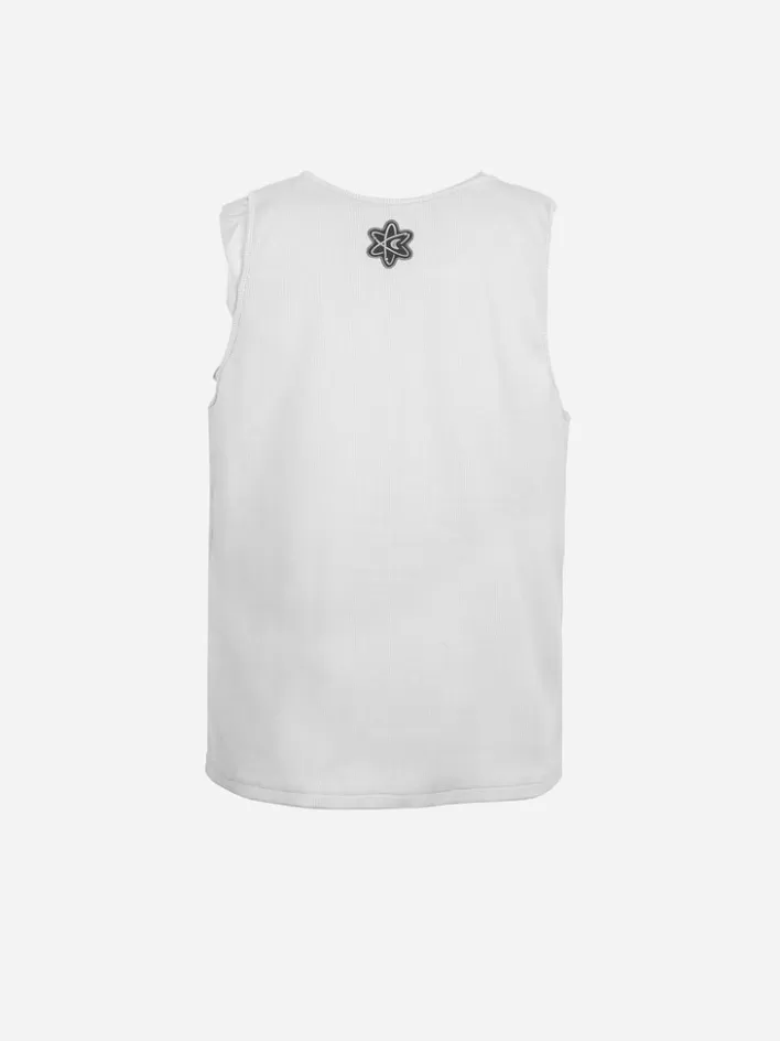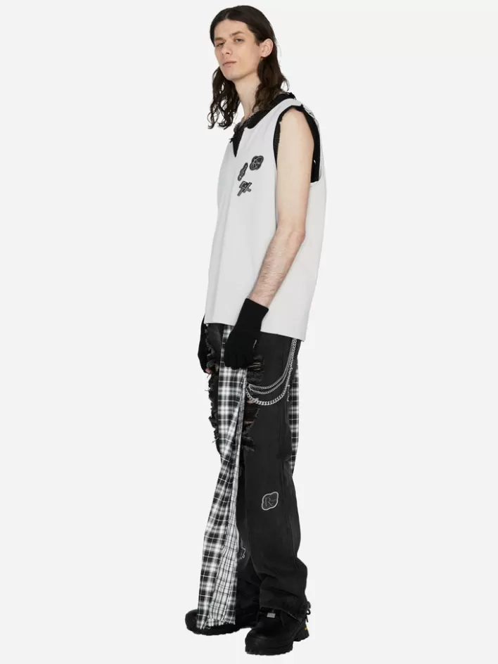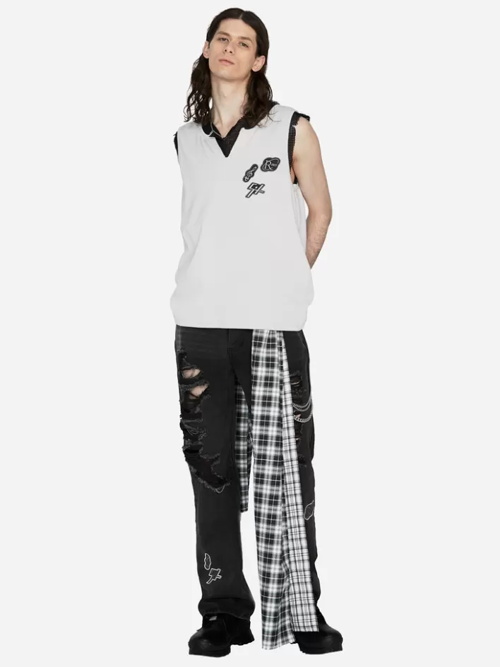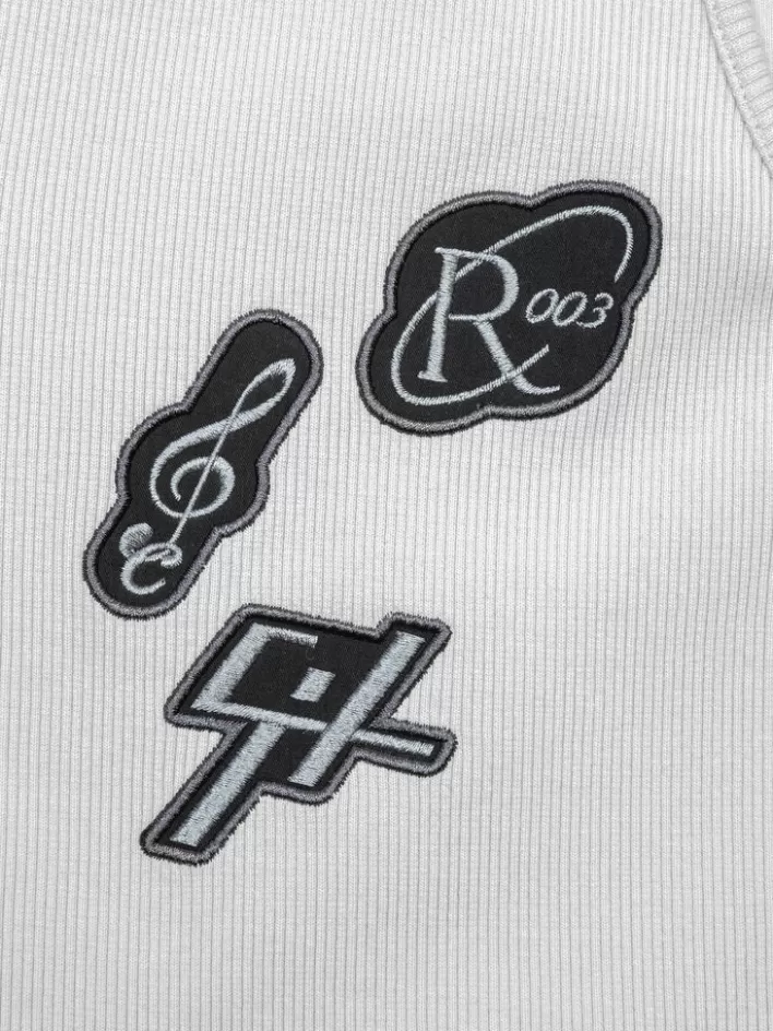 Sleeveless Paneled Stretch Rib Knit Cotton And Cotton Jersey Tank Top In Off-White. Layered Construction. Raw Edges Throughout. Cut-Out At Crewneck Collar. Applique Graphic Patches In Black And Silver-Tone At Front And Back.