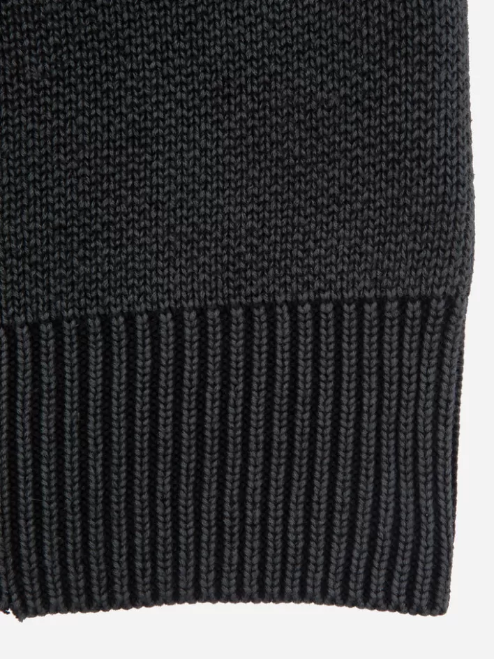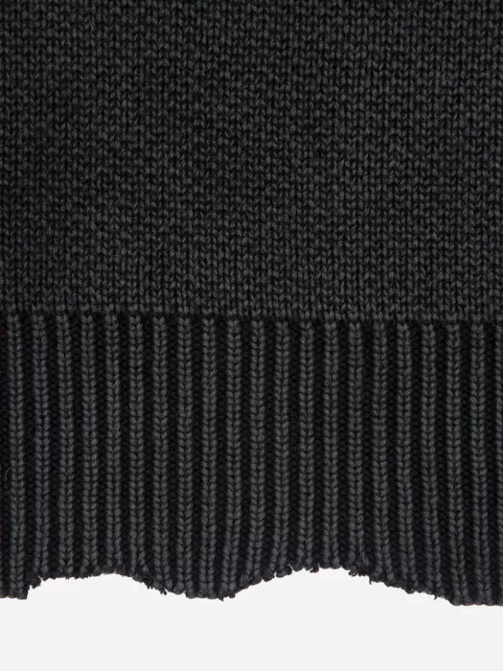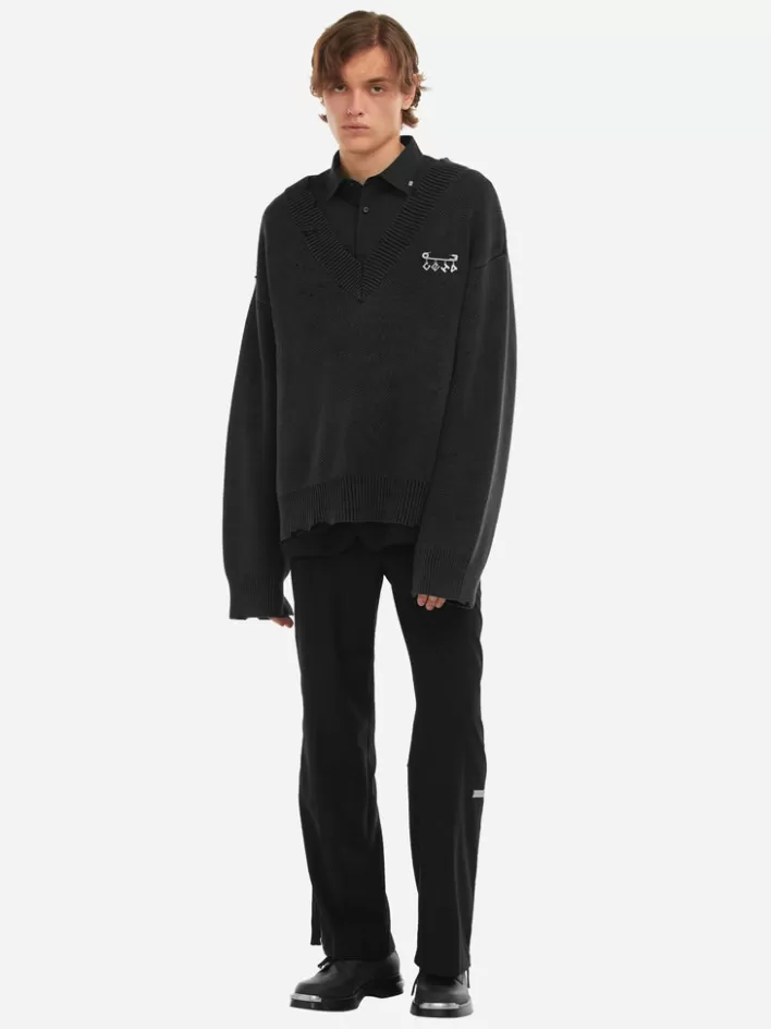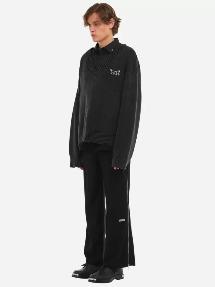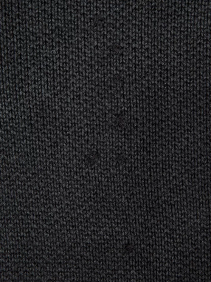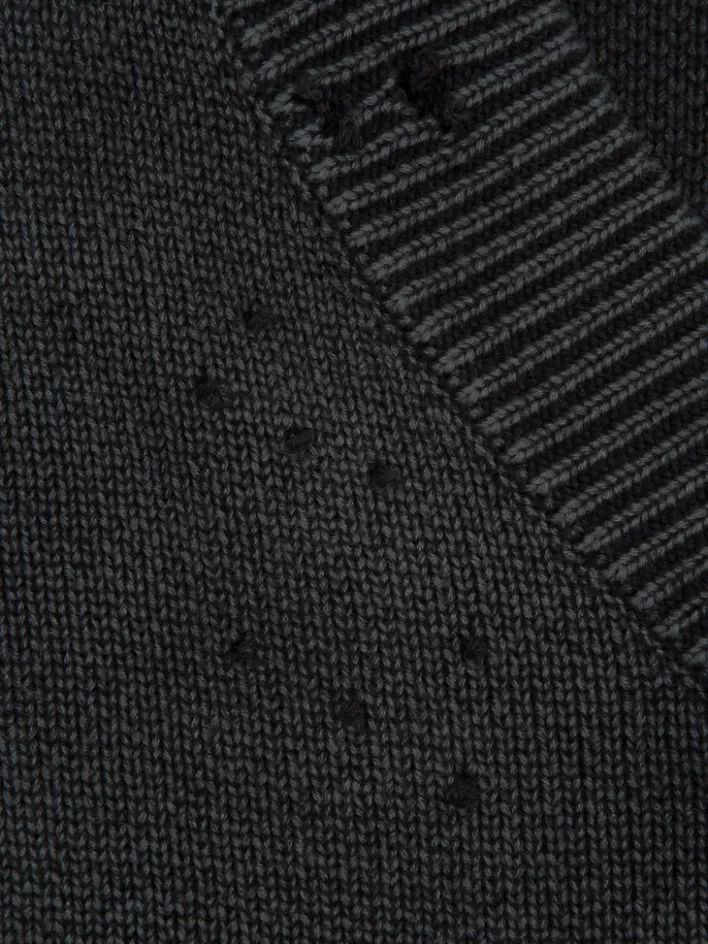 – Distressing At Rib Knit V-Neck Collar, Cuffs, And Hem