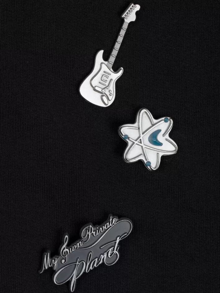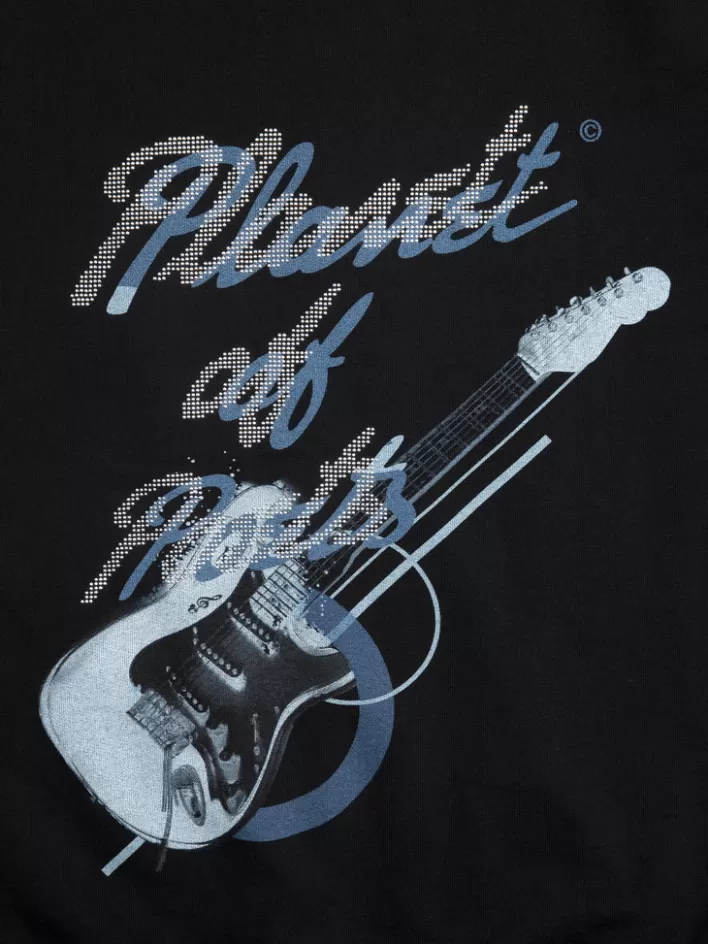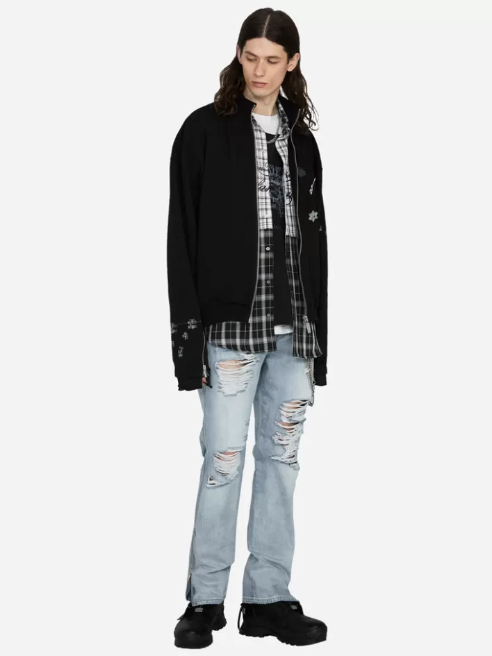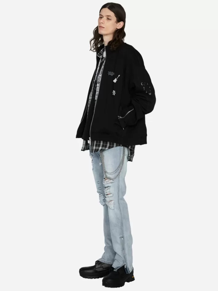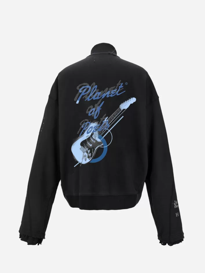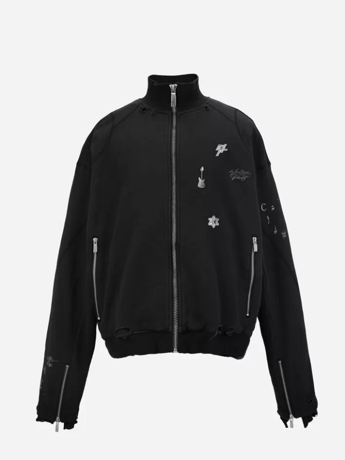 Long Sleeve Cotton Fleece Jacket. Zipper Closure At Front. Zippered Pockets At Waist. Rib Knit Collar And Hem. Overlocking Details Throughout. “Grunge Guitar” Graphic Printed At Front Features Ironed Convex Copper Stud. Graphic Printed At Sleeves. Layered Cuffs With Distressed Cotton Jersey Layer And Zipper. Comes With Special Collection Pin Set.