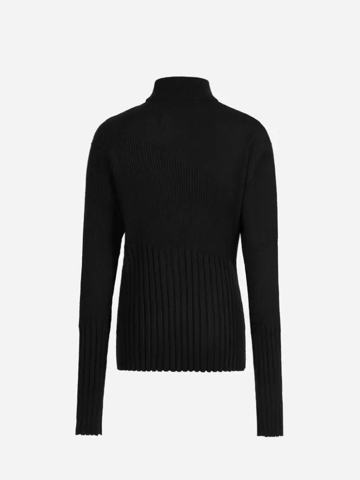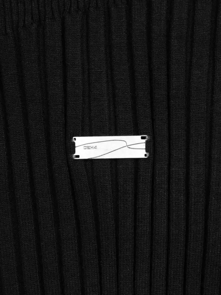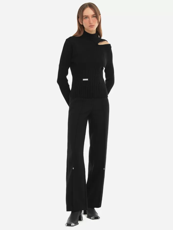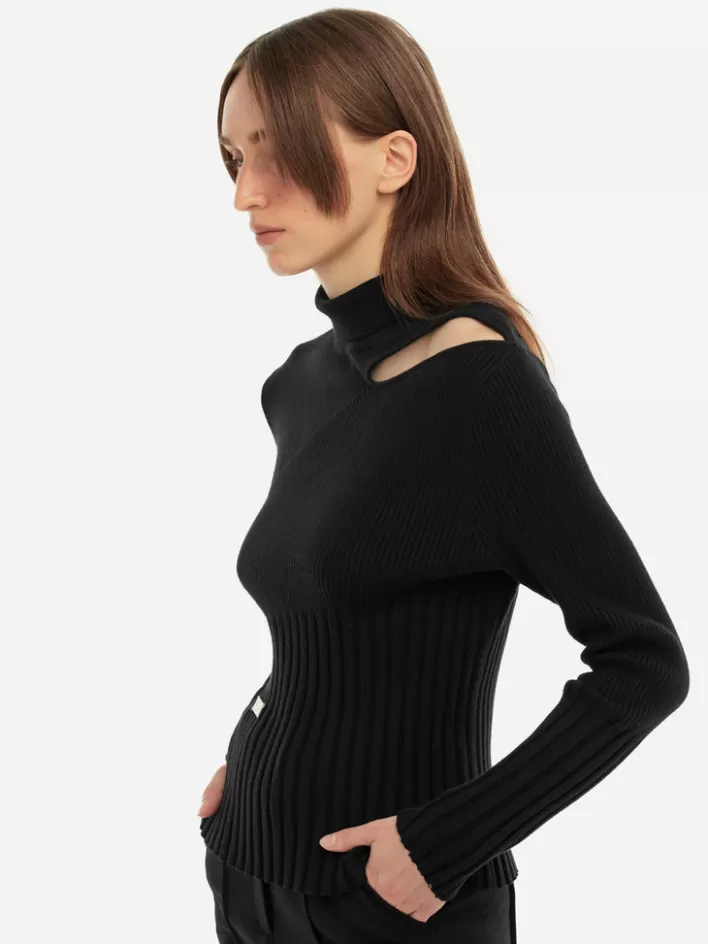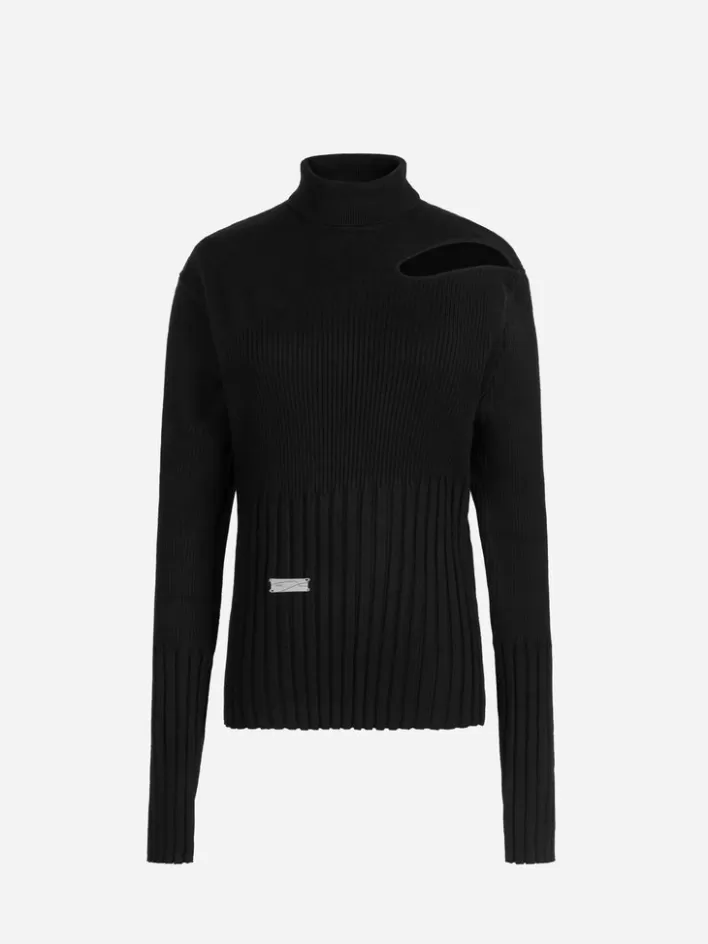 – Turtleneck Collar- Panelled Knits Pattern Throughout- Hollow-Out Detail At Shoulder- Hand Stitched Logo Engraved Metal…