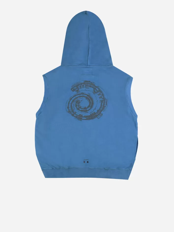 Boxy Long Sleeve Garment-Washed Fleece Hoodie In Grey And Blue. Drop Shoulder. Armhole With Zipper For Detachable Sleeve. Welt Pockets At Side Waist. Oversized Hood. Rib Knit Cuffs And Hem. Features Screen Printed In Grey At Front And Back. Two Eyelets At Back. Tonal Stitching.