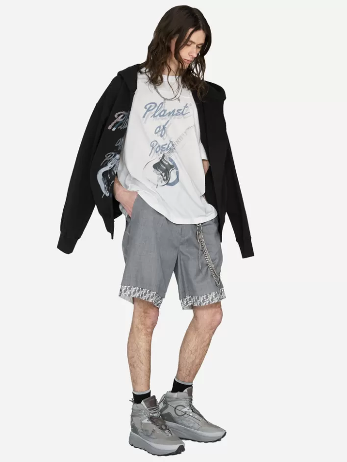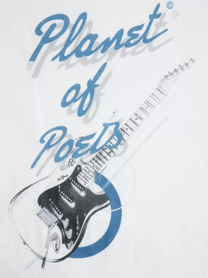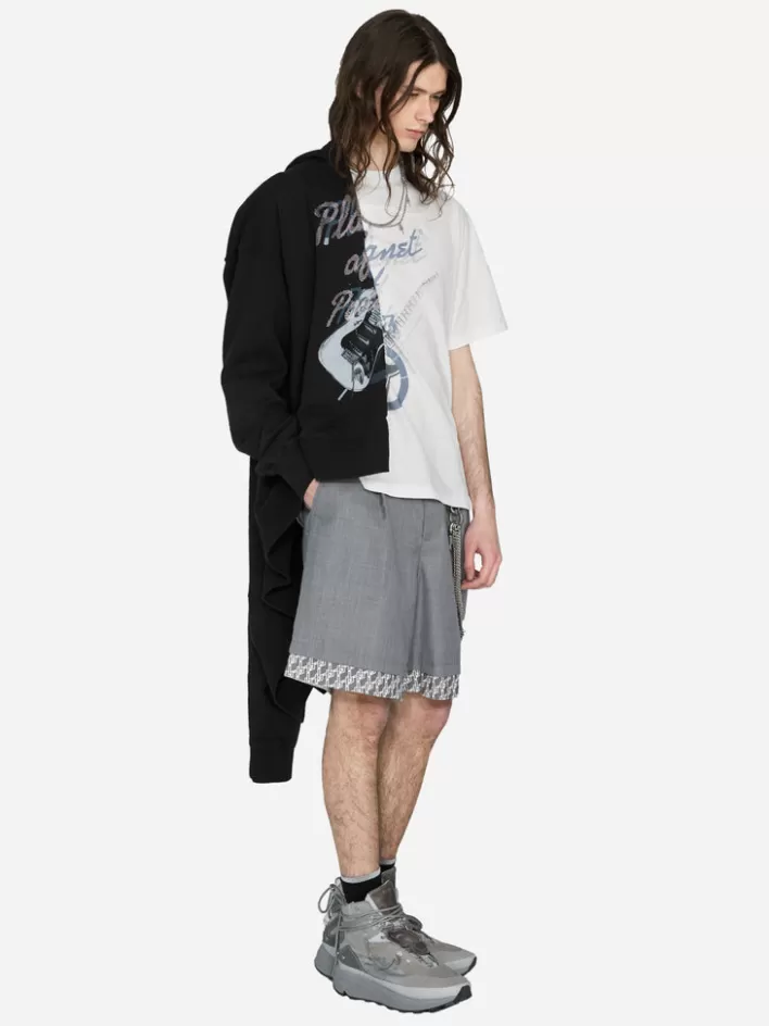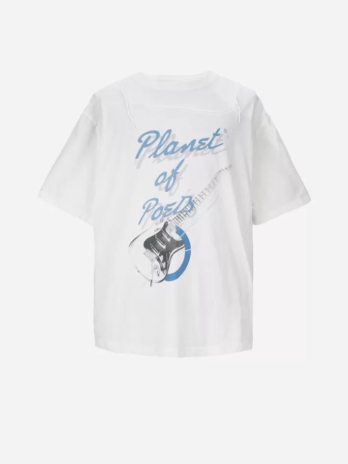 Short Sleeve Light Weight Cotton Jersey Panelled T-Shirt. Crewneck Collar. Raw Edge Details Throughout. “Grunge Guitar” Graphic Printed At Front. Text Printed At Back. Tonal Stitching.