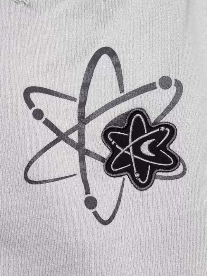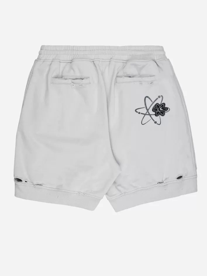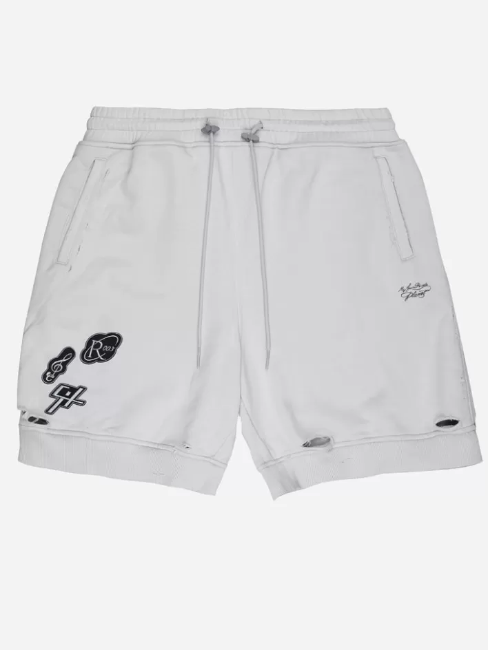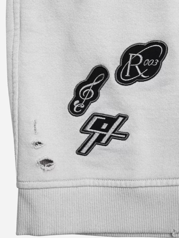 French Terry Shorts In. Mid-Rise. Distressing Throughout. Four-Pocket Styling. Drawstring At Elasticized Waistband. Tonal Embroidered Logo And Embroidered Graphic Patch In Black And Grey At Front. Rib Knit Cuffs. Embroidered Graphic Patch And Printed Graphic In Black And Grey At Back.