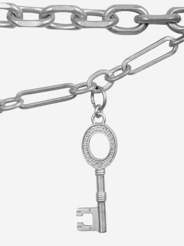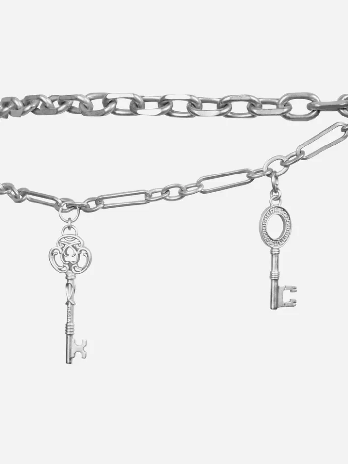 – Muti Chain Combined- Triple Ring Combined Antiqued Metal Chain Features White Gold Coated Keys Pendant