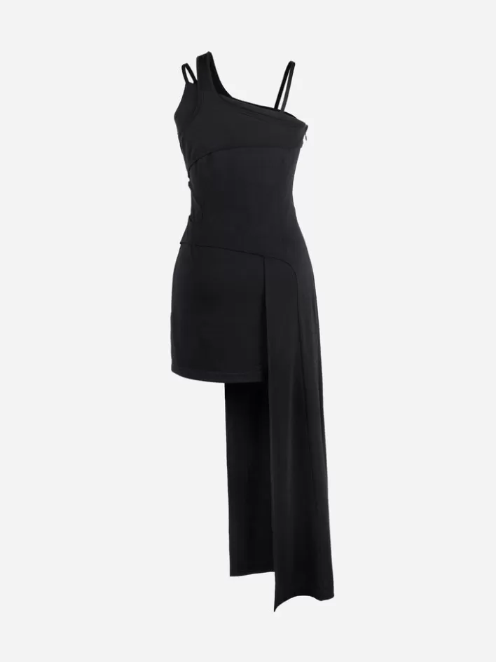 – Sleeveless Asymmetric Midi Dress In Black- Layered Construction- Cut Out Details- Multi Shoulder Strap- Hidden Zippere…