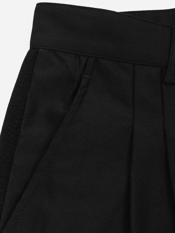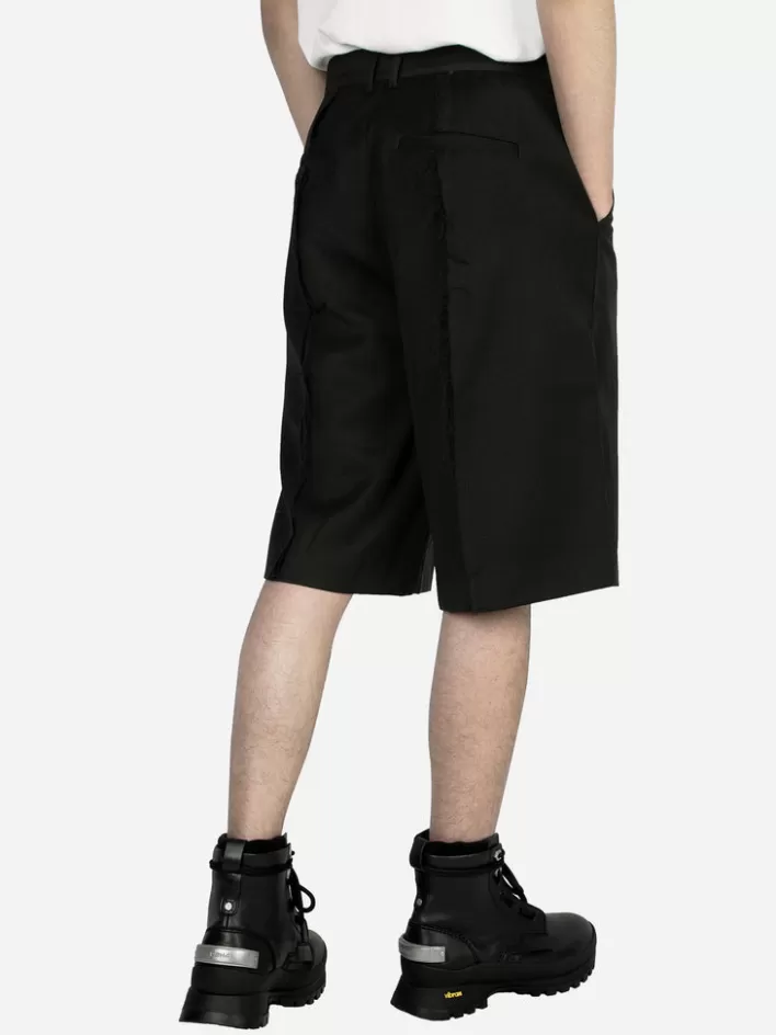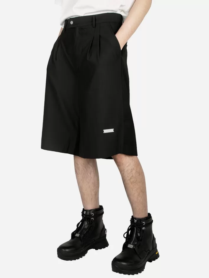 Viscose-Blend Twill Panelled Twill Shorts In Black. Mid-Rise. Five-Pockets Styling. Belt Loops At Waistband. Pleats At Front. Antiqued Logo Engraved Hand Stitch Metal Tag At Front. Zip-Fly. Silver-Tone Hardware.