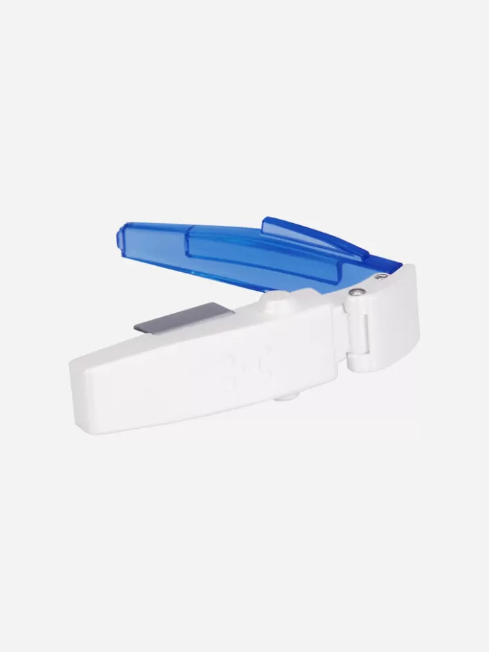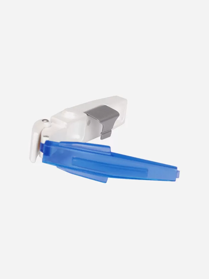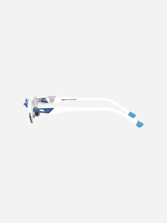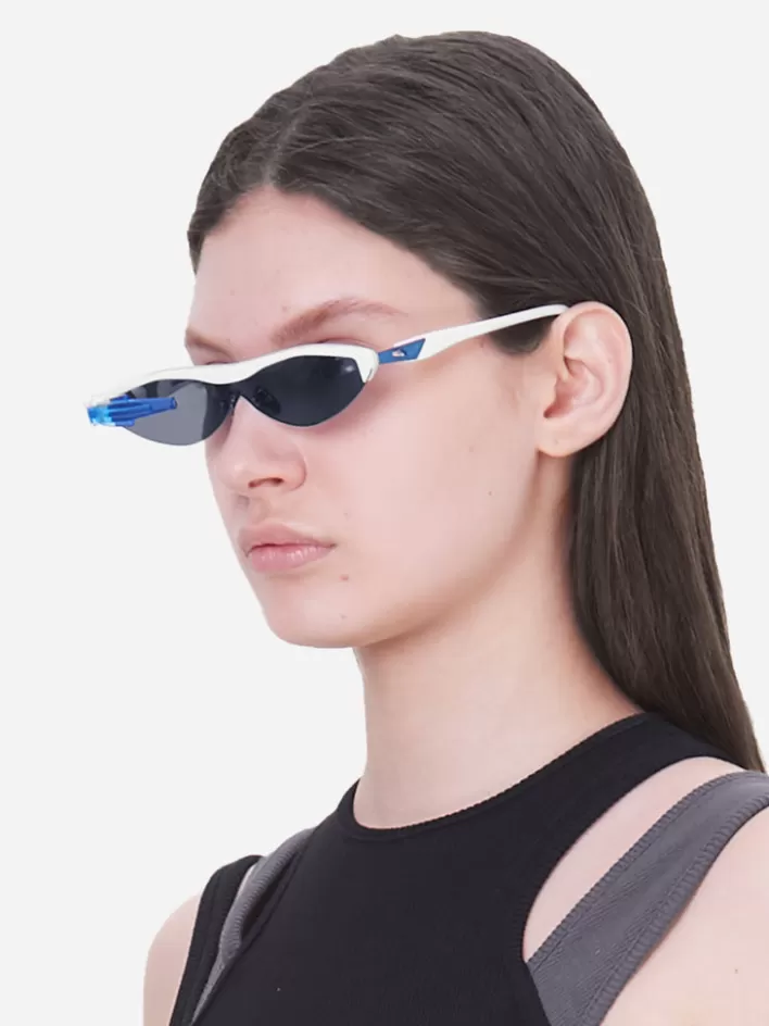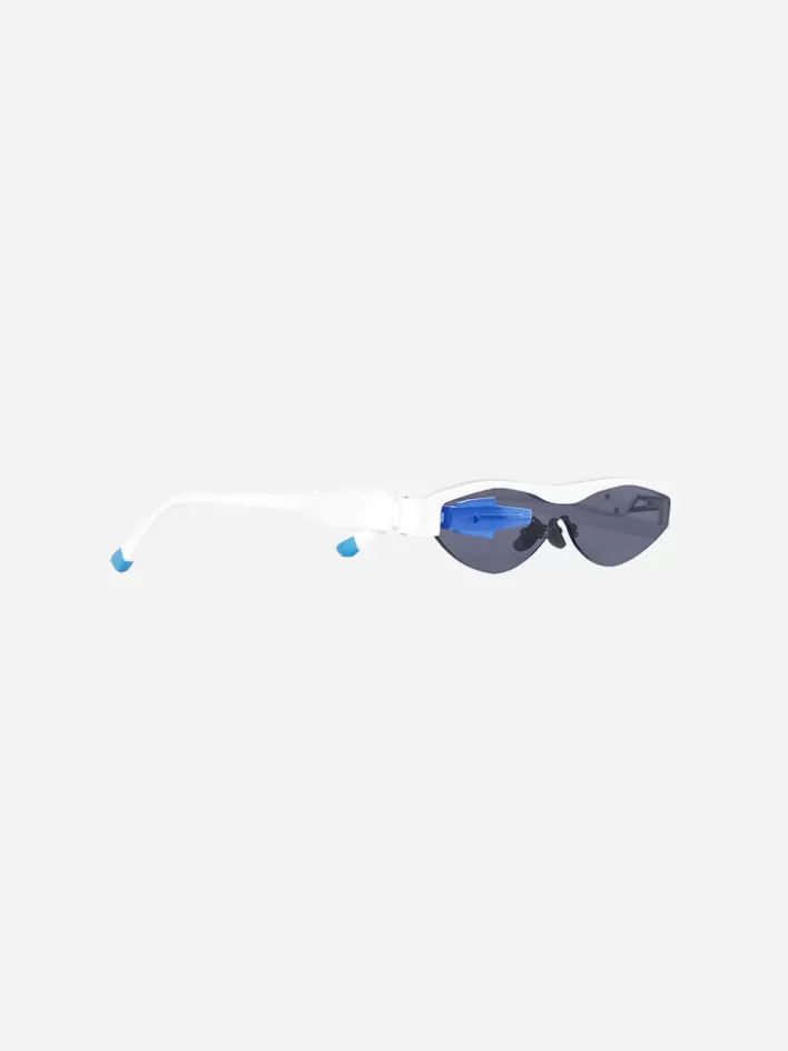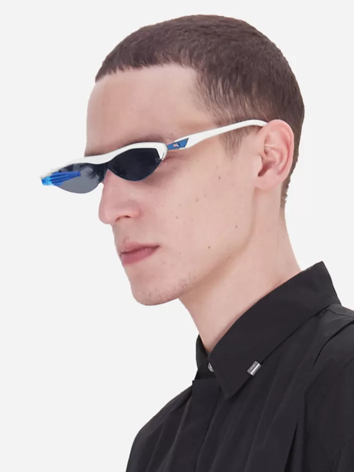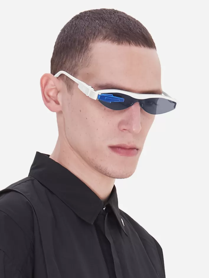 Oval Stainless Steel And Acetate Frame Sunglasses In White Tone. Dark Blue Lenses With 100% Uv Protection. Dark Blue Half-Transparent Rubber Nose Pads. Engraved Logo At Temples. Rubberized Temple Tips In Blue. Glasses Featuring With Detachable Scouter Accessories In White And Blue With Engraved Logo.
